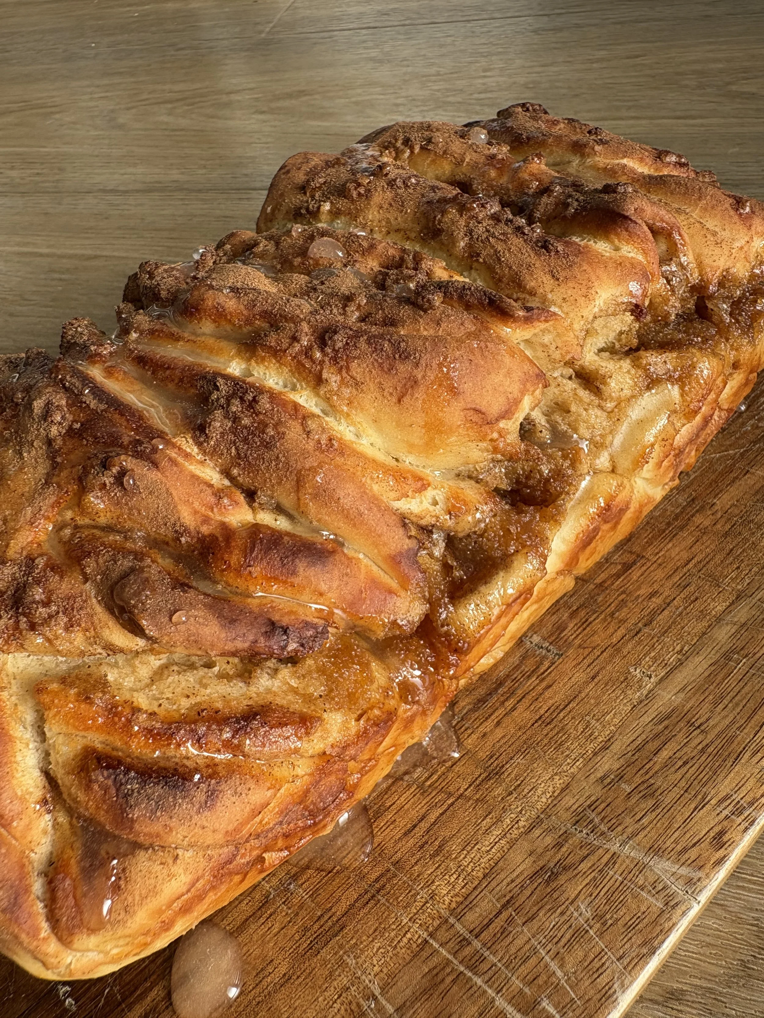6. Spread cinnamon sugar mix on half of each of the dough discs, then fold the disc in half and place up right into a lined loaf tin