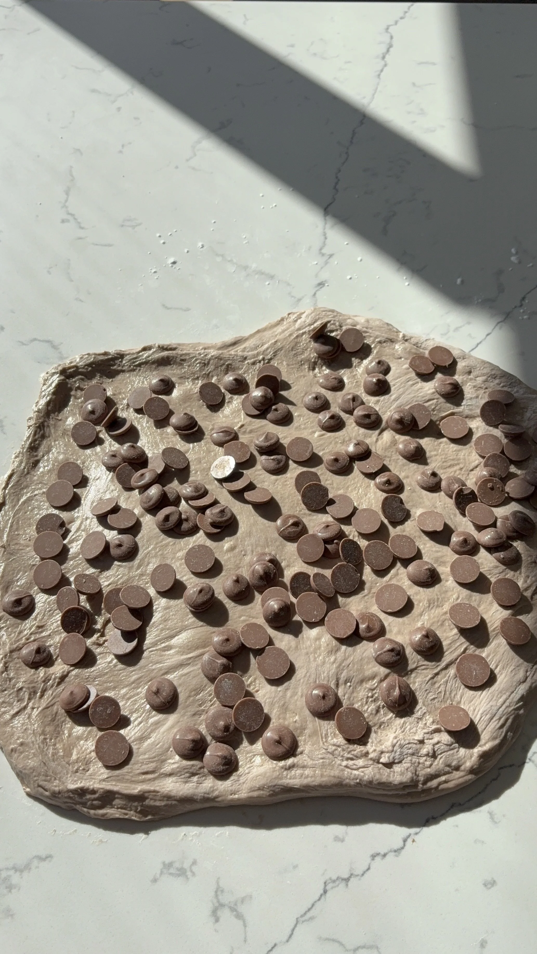 Laminate your dough into a rectangle on the bench, sprinkle over your cup of chocolate chips and then fold into a log, then roll your log to a ball, shape with a push and pull motion